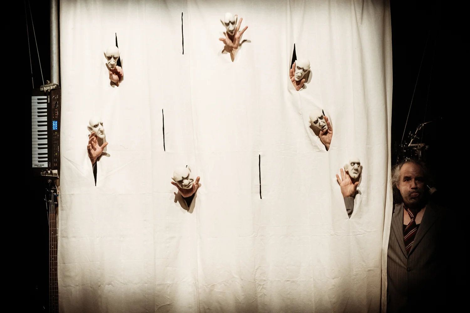 Matija Solce’s project, a cabaret inspired by motifs from Alfred Jarry’s epic, brings together musicians, puppeteers, and actors at the crossroads of political theatre, object theatre, grotesque “merdre” operetta, and Dadaist concert. King Ubu needs no updating—its relevance is universal, grotesquely exposing the ever-present immoral, hypocritical, cowardly, servile, and greedy self-proclaimed “kings.” Unlike the scandalous original that shocked late-19th-century France, Teater Matite’s production uses language as sound, signal, and deconstruction. Words morph into barking, music, a fart symphony, or a poetic mass execution. A quintet of “Dadaists”—actors, musicians, animators, and eccentric creators—draws us into UBU-ism, pataphysics, and ironic social critique. With toilet brushes, mime puppets, drums, keyboard, bass, and their own bodies, they perform a disturbing aspiration of our time: to serve an idiot. U!-BU? goes beyond grotesque spectacle. It provokes through interactions with the body and by pressuring our status symbols, ideologies, and beliefs. Like Ubu himself, the performance confronts all levels of society head-on, critically examining everything—while knowingly sparing itself. Join this eccentric, high-energy cabaret that playfully—and undemocratically—insists on its singular truth. Theatre is dead. Long live theatre!